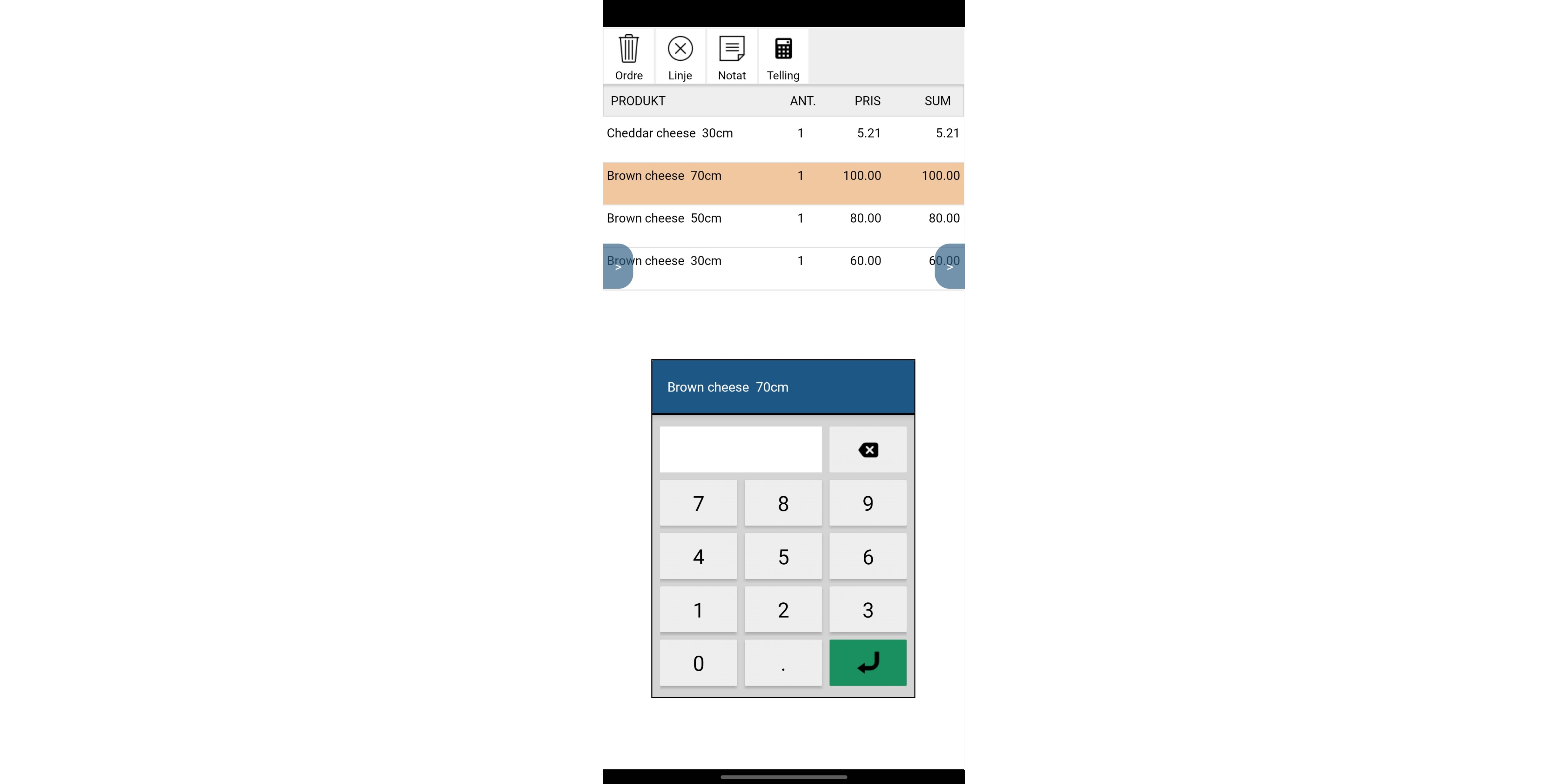 Trykker du på en vare etter at du har lagt den til kommer det opp et pop-up vindu hvor du enkelt kan slå inn antall som du har på lager av den varen.